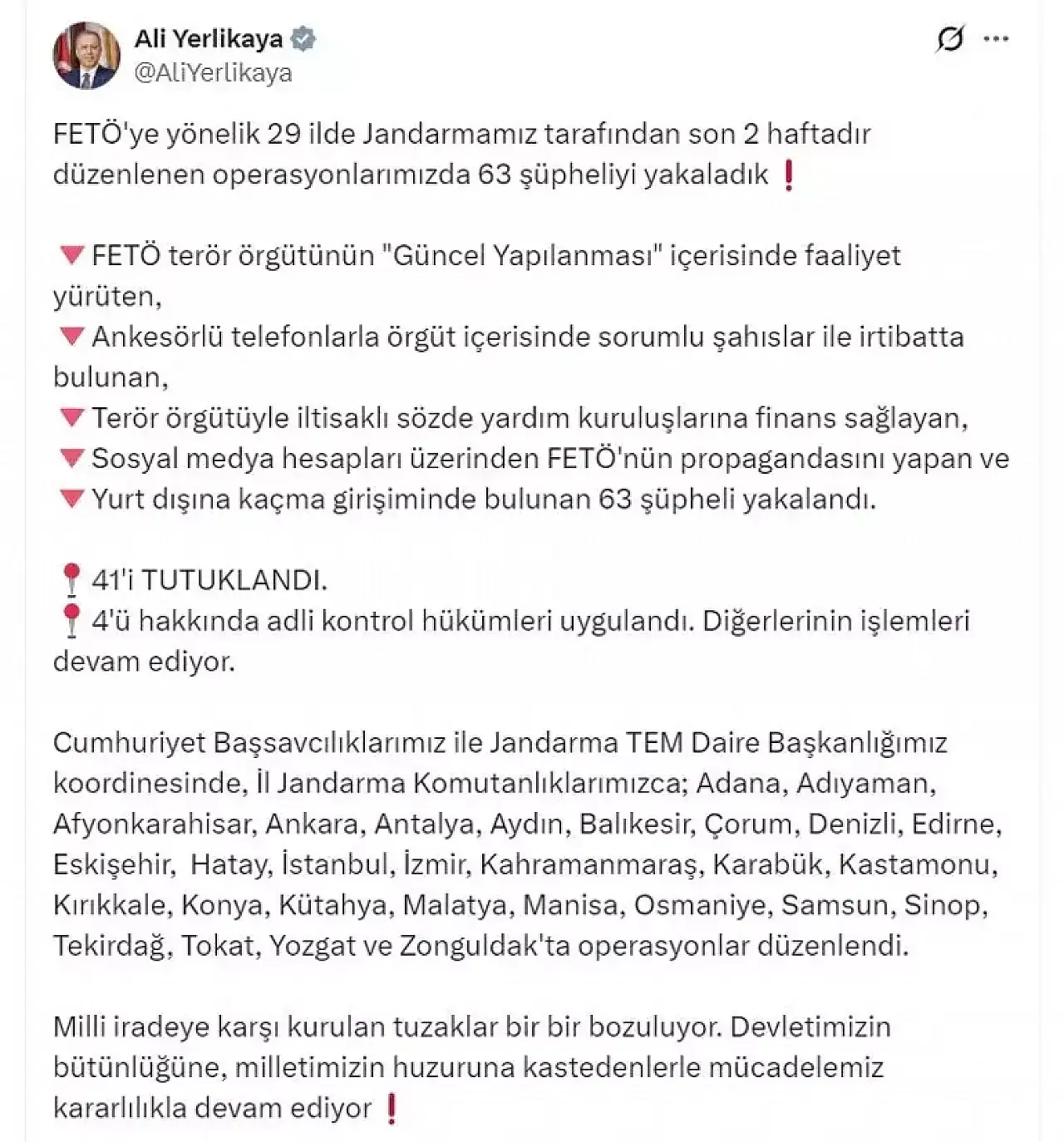 Bakan Yerlikaya, sanal medya hesabından yaptığı açıklamada, son 2 haftada Cumhuriyet başsavcılıkları ile Jandarma Terörle Mücadele (TEM) Daire Başkanlığı koordinesinde; Adana, Adıyaman, Afyonkarahisar, Ankara, Antalya, Aydın, Balıkesir, Çorum, Denizli, Edirne, Eskişehir, Hatay, İstanbul, İzmir, Kahramanmaraş, Karabük, Kastamonu, Kırıkkale, Konya, Kütahya, Malatya, Manisa, Osmaniye, Samsun, Sinop, Tekirdağ, Tokat, Yozgat ve Zonguldak'ta FETÖ'ye yönelik operasyonlar düzenlendiğini belirtti. Yerlikaya, FETÖ terör örgütünün 'güncel yapılanması' içerisinde faaliyet yürüten, ankesörlü telefonlarla örgüt içerisinde sorumlu kişilerle irtibatta bulunan, terör örgütüyle iltisaklı sözde yardım kuruluşlarına finans sağlayan, sanal medya hesapları üzerinden FETÖ'nün propagandasını yapan ve yurt dışına kaçma girişiminde bulunan 63 şüphelinin yakalandığını ifade ederek, "Şüphelilerden 41'i tutuklandı. 4'ü hakkında adli kontrol hükümleri uygulandı. Diğerlerinin işlemleri devam ediyor. Milli iradeye karşı kurulan tuzaklar bir bir bozuluyor. Devletimizin bütünlüğüne, milletimizin huzuruna kastedenlerle mücadelemiz kararlılıkla devam ediyor. Emeği geçenleri tebrik ediyorum" dedi.