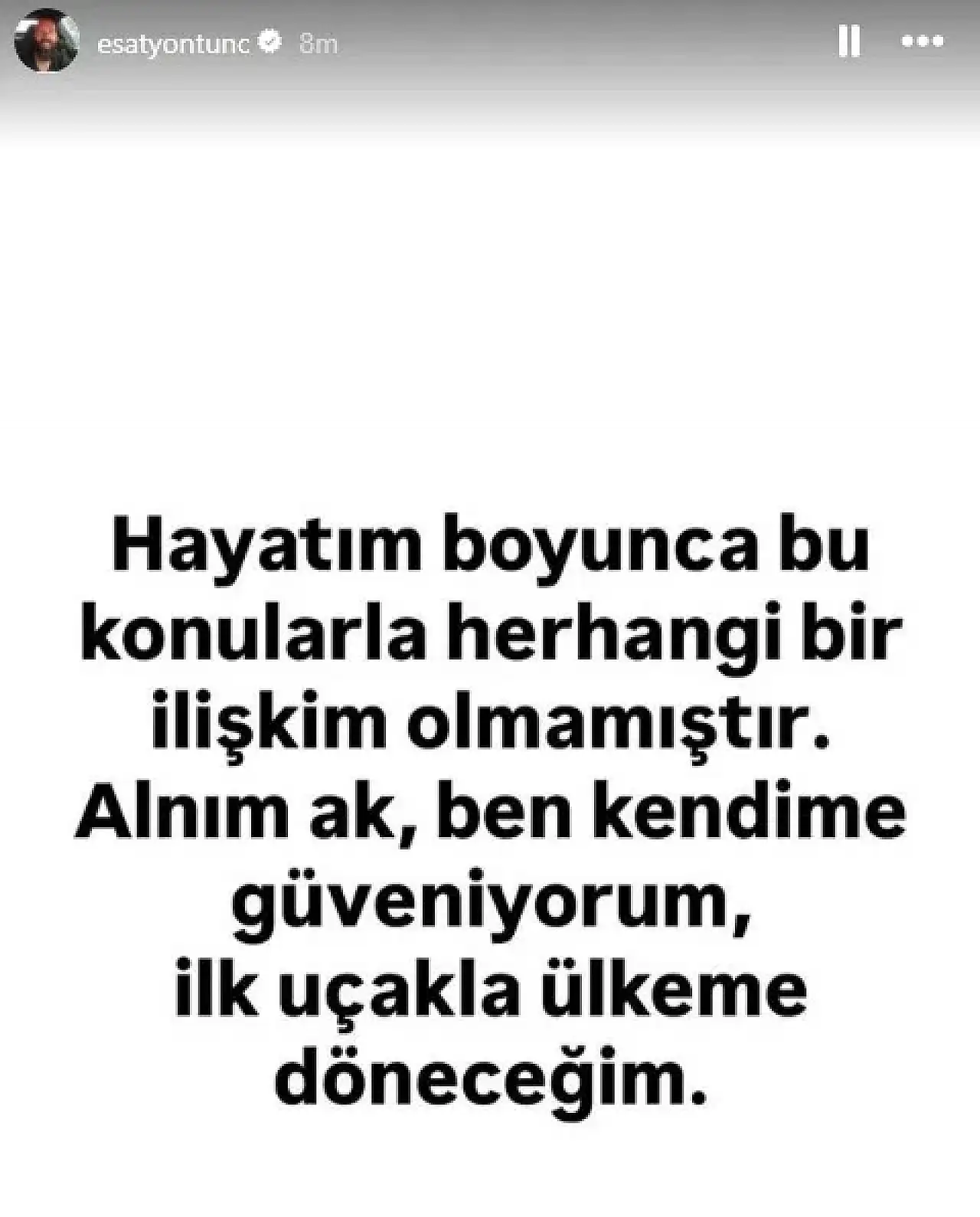 Hakkındaki yakalama kararını öğrenen Esat Yontunç, sosyal medya hesabından yaptığı açıklamayla iddiaları kesin bir dille reddetti. Hayatı boyunca bu tarz konularla ilişkisi olmadığını savunan Yontunç, şu ifadeleri kaydetti: