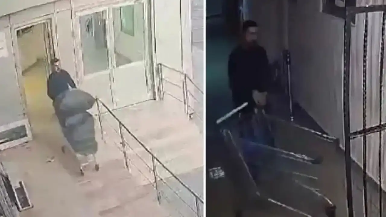 Görüntülerde, şüpheli Erdal T.’nin market arabasıyla içeri girdiği ve emanet bürosundaki değerli eşyaları çöp poşetine doldurarak arabayla taşıdığı görülüyor.