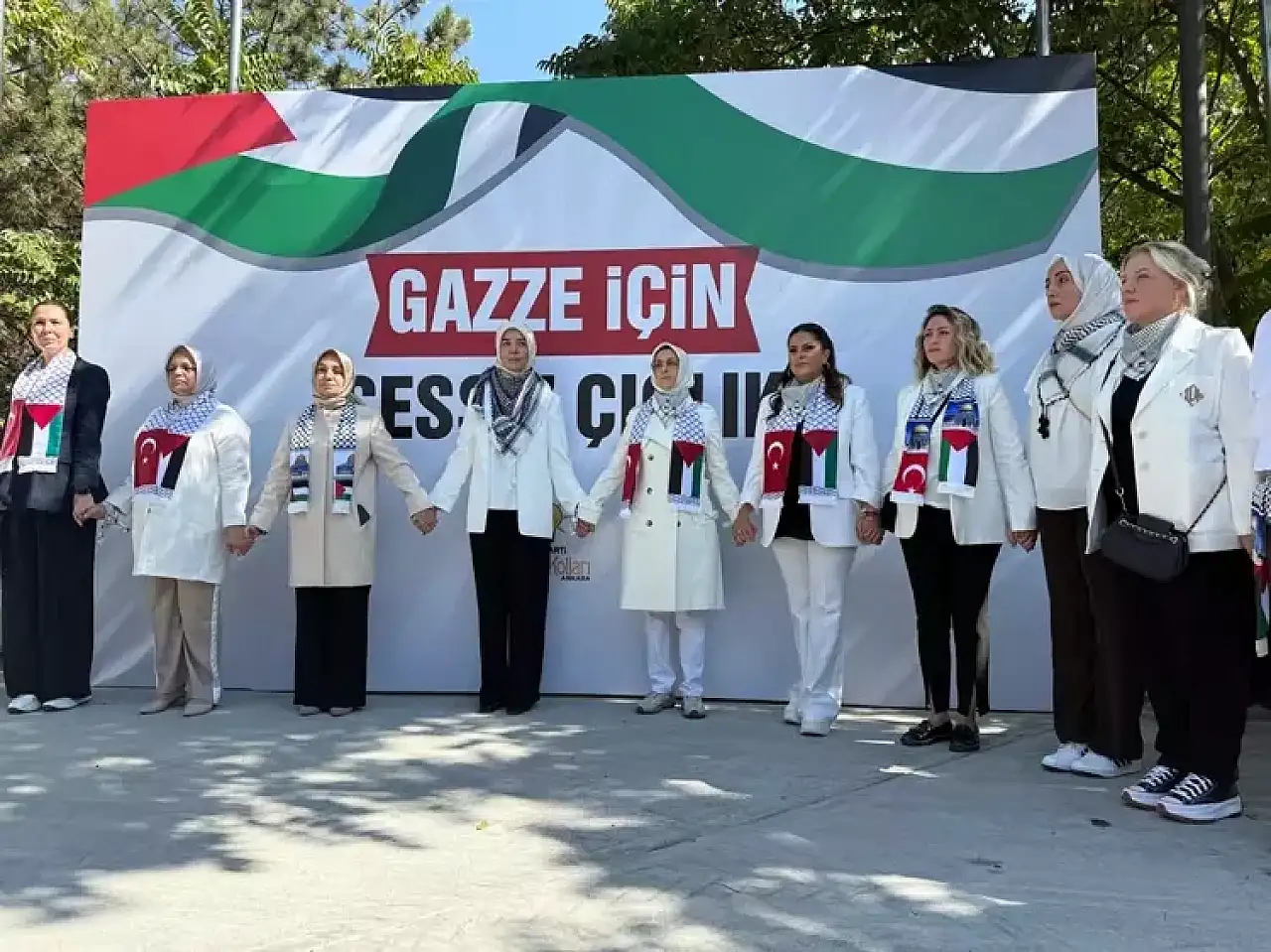 AK Parti Ankara İl Kadın Kolları Başkanı Aysel Koçak Akgül, grup adına yaptığı açıklamada, kadınlar olarak Gazze'nin sessiz çığlığına ses olmak için el ele verdiklerini tüm dünyaya göstermek adına meydanlarda olduklarını kaydetti. Akgül, "Bugün 81 ilde kurduğumuz bu zincir, Gazze'de evlatlarını kaybeden anne babaların zinciridir, öksüz, yetim bırakılan çocukların zinciridir ve insanlığını kaybetmeyen herkesin zinciridir. Biz, 'Yaralıları mı kurtaracaktım, şehitleri mi taşıyacaktım ya da bir torba un mu bulmaya çalışacaktım? Yemin ederim eve tek bir torba un getirip, çocuklarımın karnının doyacağını bilsem, ölüme razı olurum' diyen Gazzeli annenin sesi olmak için, bu sesi dünyaya duyurmak için buradayız.