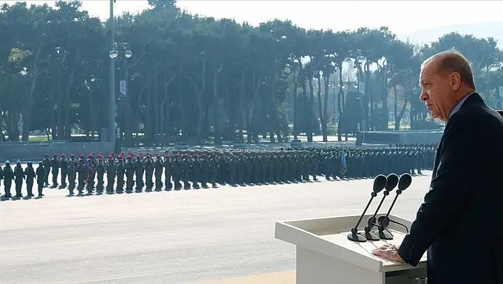 Cumhurbaşkanı Recep Tayyip Erdoğan, Azerbaycan'ın başkenti Bakü'de, Karabağ Zaferi'nin beşinci yıl dönümünde düzenlenen 8 Kasım Zafer Günü Töreni'ne katılarak bir konuşma yaptı.
