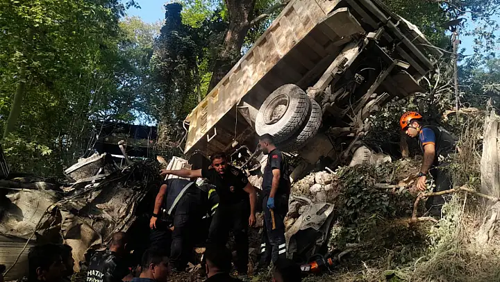 Hatay'ın Defne ilçesinde freni patlayan hafriyat kamyonu, uçurumdan yuvarlanarak güvenlik kulübesinin üzerine düştü. Kazada 1 kişi hayatını kaybetti, 1 kişi ağır yaralandı.