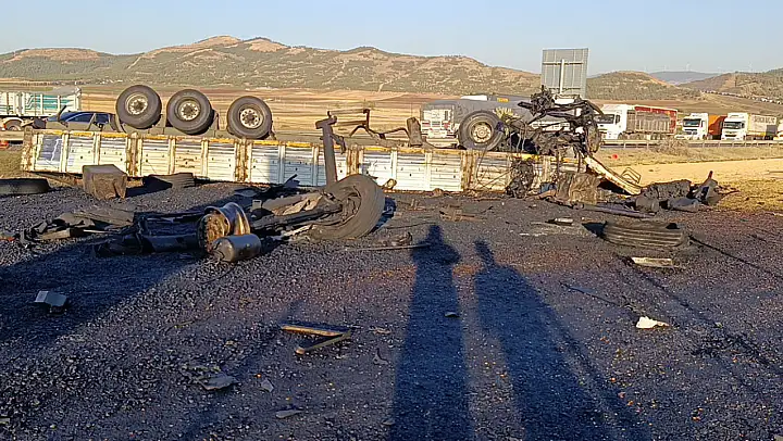 Gaziantep'te freni patlayan tır, yol çalışması yapan iş makinasına çarptı. Kazada tır paramparça olurken, araçlarda yangın çıktı. Sürücüler son anda araçtan atlayarak kurtuldu.