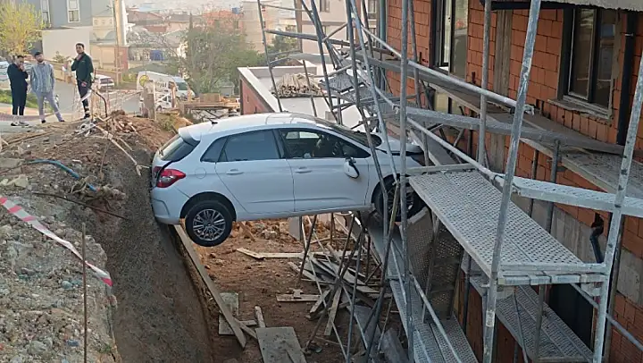 Kartal'da kontrolden çıkan otomobil istinat duvarı ile inşaat halindeki binanın boşluğunda asılı kaldı. Otomobil içerisinde bulunan 4 kişi itfaiye ekiplerince kurtarıldı.