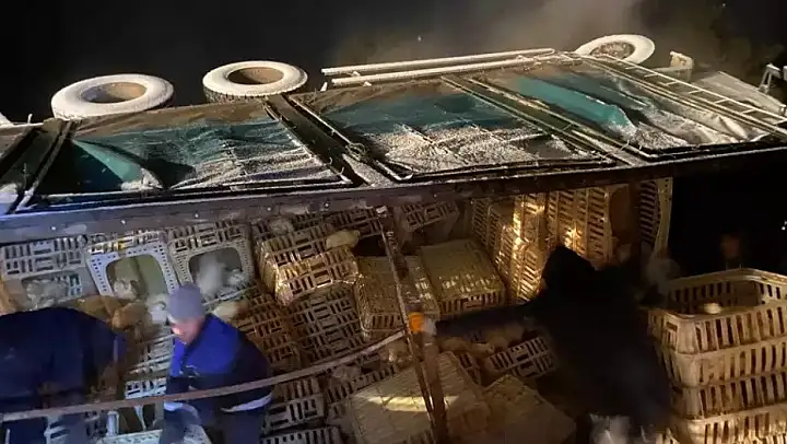 Kamyondan savrulan ve plastik kasalara sıkışan yüzlerce tavuk ise öldü. Kazada canlı kalan tavuklar da başka bir kamyona nakledildi. Kamyonun kasasında toplam 3 bin canlı tavuğun bulunduğu öğrenildi.