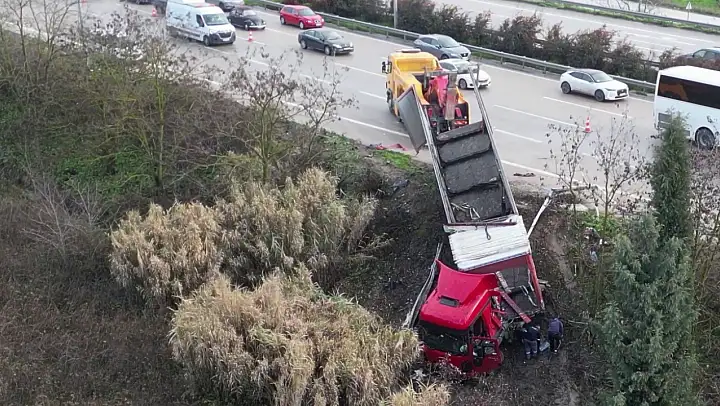 Bursa'da kontrolden çıkan tır refüje uçtu. Facianın teğet geçtiği kazada sürücü yaralanırken, otobanda trafik uzun kuyruklar oluşturdu.