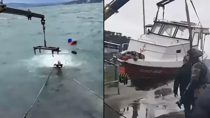 Lodos nedeniyle batanbalıkçı teknesi vinç yardımıyla çıkarıldı