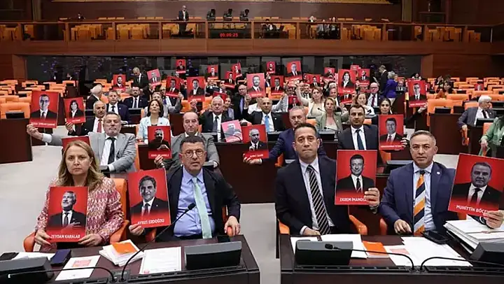 TBMM Genel Kurulu'nda CHP'li milletvekilleri, Adana Büyükşehir Belediyesi, Antalya Büyükşehir Belediyesi ile Adıyaman Belediyesine düzenlenen operasyonları ve belediye başkanlarının tutuklanmasını protesto etti.