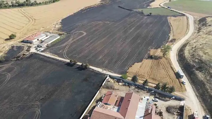 Tekirdağ'ın Saray ilçesinde çıkan tarla yangınında yaklaşık 100 dönüm ekili arazi kül oldu, yangın sonrası yanan alan dron ile havadan görüntülendi.