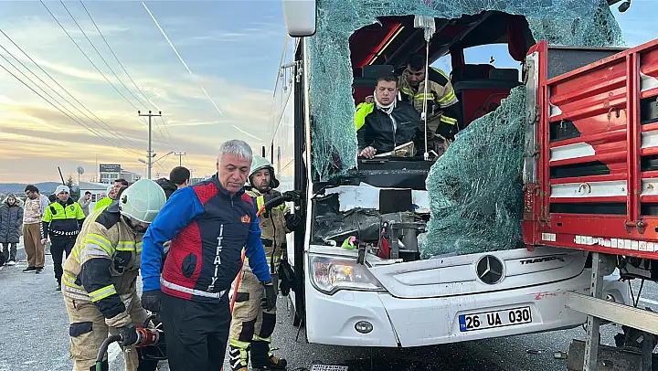 Kütahya'da yolcu otobüsü, kırmızı ışıkta durmak için yavaşlayan TIR'a arkadan çarptığı kazada 13 kişi yaralandı.