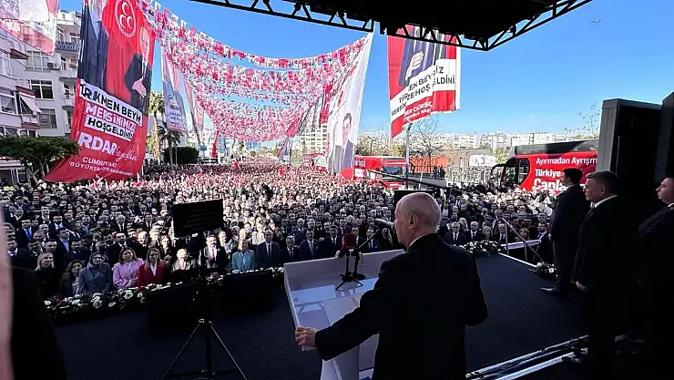 Bahçeli, Mart ayındaki yerel seçimler öncesi ilk mitingini, 'Cumhur bizim Türkiye hepimizin' temasıyla Mersin Millet Bahçesi yanındaki alanda yaptı. 31 Mart seçimlerinin ülkeye, demokrasiye, milli birlik ve dirliğe hayırlar getirmesi dileklerinde bulunan Bahçeli, "Mersin kardeşliğin timsalidir, aymazlığa geçit yoktur. Mersin son 5 yıldır yerinde saymakta. İdeolojik belediye anlayışı Mersin’i yorgun düşürmüştür. Hukuksuzluk Mersin’in yolunu kapatmıştır. Şimdiye kadar kazanan bir avuç çıkarcıdır. CHP’li büyükşehir belediyesi, bağlanan umutları israf etmiştir, hayal kırıklığı devasa boyutlara ulaşmıştır. Devamlı şaibelerle anılan bir belediye yönetimi karşımızdadır. CHP zihniyeti hepten çuvallamıştır. Başaracak olan Mersin sevdalıları şehremini vazifesini üstlenmeli. Kayırmacılık, yolsuzluk Mersin'in önünü kapattı. Üretmeyenlere, Mersin’i tanımayanlara uğurlar olsun demeliyiz. Mersin için ümitler yeşermiştir. Mersin bizim, Türkiye hepimizindir. DEM'lenen, dejenere olmuş CHP'ye karşılık veriyorsunuz. Mersin ayak bağlarını söküp atacaktır" diye konuştu.