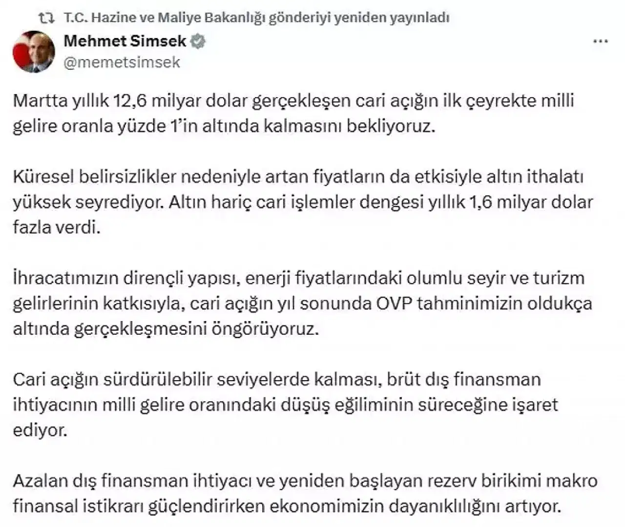 Hazine ve Maliye Bakanı Mehmet Şimşek, ödemeler dengesi istatistiklerine ilişkin sosyal medya hesabından açıklama yaptı. Bakan Şimşek, "Martta yıllık 12,6 milyar dolar gerçekleşen cari açığın ilk çeyrekte milli gelire oranla yüzde 1'in altında kalmasını bekliyoruz. Küresel belirsizlikler nedeniyle artan fiyatların da etkisiyle altın ithalatı yüksek seyrediyor. Altın hariç cari işlemler dengesi yıllık 1,6 milyar dolar fazla verdi. İhracatımızın dirençli yapısı, enerji fiyatlarındaki olumlu seyir ve turizm gelirlerinin katkısıyla, cari açığın yıl sonunda OVP (Orta Vadeli Program) tahminimizin oldukça altında gerçekleşmesini öngörüyoruz. Cari açığın sürdürülebilir seviyelerde kalması, brüt dış finansman ihtiyacının milli gelire oranındaki düşüş eğiliminin süreceğine işaret ediyor. Azalan dış finansman ihtiyacı ve yeniden başlayan rezerv birikimi makro finansal istikrarı güçlendirirken ekonomimizin dayanıklılığını artırıyor" ifadelerini kullandı.