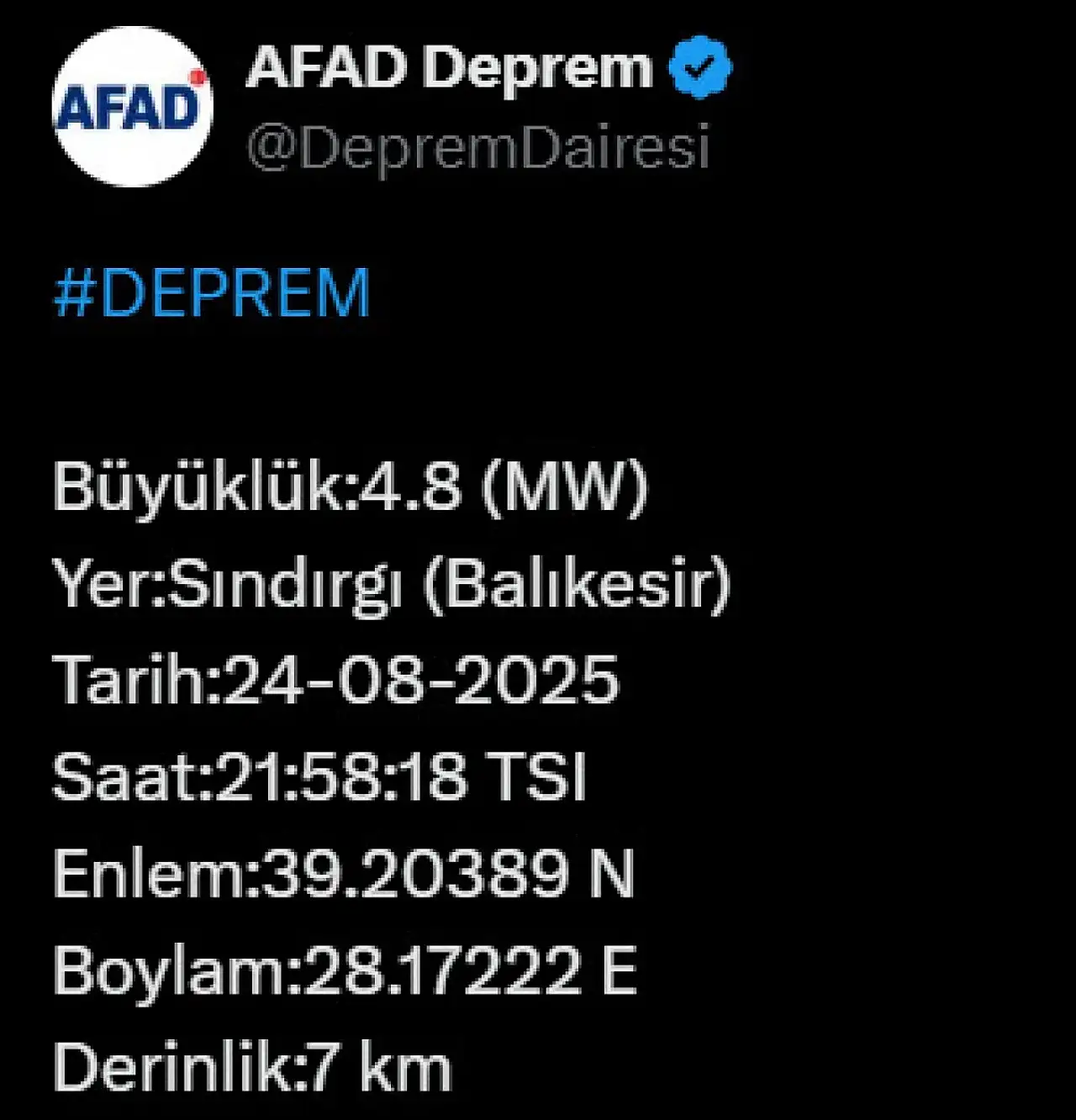 AFAD'ın paylaştığı bilgilere göre, Balıkesir'in Sındırgı ilçesinde saat 21.58'de 4.8 büyüklüğünde deprem meydana geldi. Merkezi Sındırgı ilçesi olan depremin derinliği 7 kilometre olarak ölçüldü.