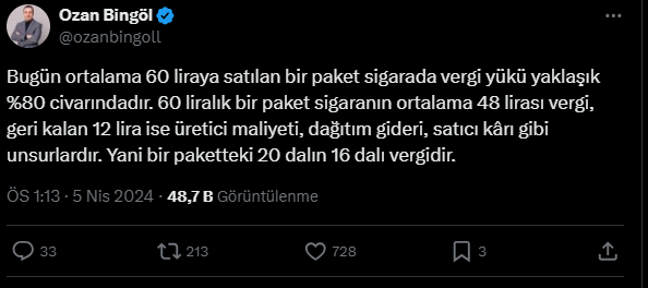 Sosyal medyadan yaptığı paylaşımda, bir paket sigaranın yüzde 80'inin vergiye gittiğini söyleyen Bingöl, "Bir paket sigaranın ortalama 48 lirası vergi, geri kalan 12 lira ise üretici maliyeti, dağıtım gideri, satıcı kârı gibi unsurlardır." dedi.