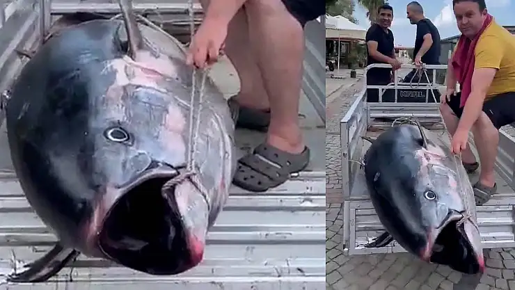 Balıkesir'in Erdek ilçesinde balıkçıların oltasına 207 kilogram ağırlığında orkinos takıldı. Sahile çıkarılan balık, restorana götürüleceği elektrikli motosikletin römorkuna güçlükle yerleştirilirken, o anlar kameraya yansıdı.