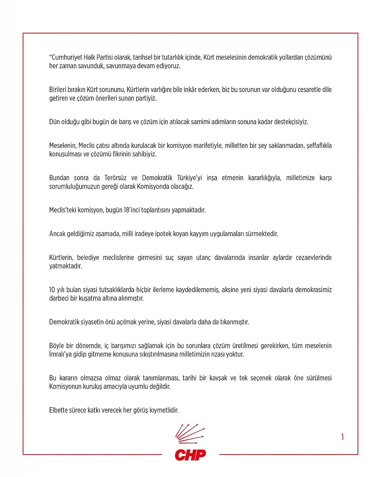 Cumhuriyet Halk Partisi, İmralı'ya gidecek olası bir heyete üye vermeme kararına ilişkin yazılı açıklama yayımladı.