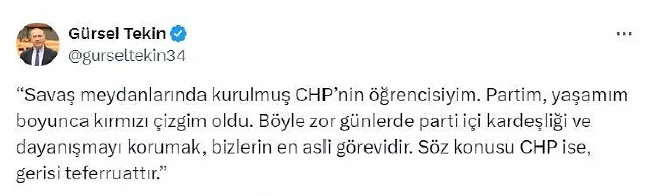 Gürsel Tekin sosyal medya hesabı üzerinden yaptığı paylaşımda, "Savaş meydanlarında kurulmuş CHP’nin öğrencisiyim. Partim, yaşamım boyunca kırmızı çizgim oldu. Böyle zor günlerde parti içi kardeşliği ve dayanışmayı korumak, bizlerin en asli görevidir. Söz konusu CHP ise gerisi teferruattır" ifadelerini kullandı.