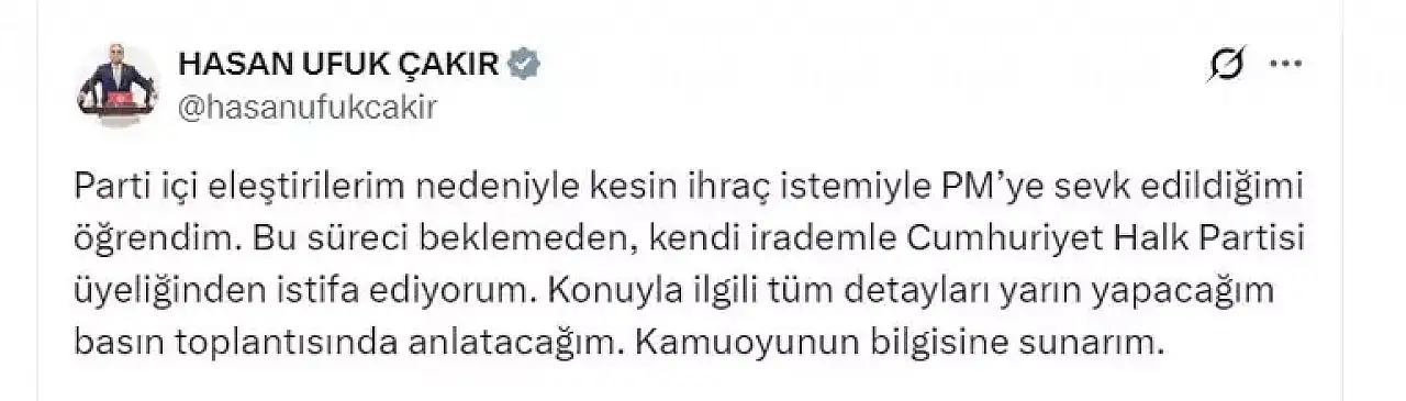 Mersin Milletvekili Hasan Ufuk Çakır, sosyal medya hesabından yaptığı açıklamada, "Parti içi eleştirilerim nedeniyle kesin ihraç istemiyle PM'ye (Parti Meclisi) sevk edildiğimi öğrendim. Bu süreci beklemeden, kendi irademle Cumhuriyet Halk Partisi üyeliğinden istifa ediyorum. Konuyla ilgili tüm detayları yarın yapacağım basın toplantısında anlatacağım. Kamuoyunun bilgisine sunarım" dedi.