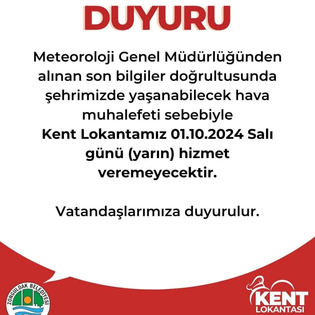 Zonguldak Belediyesi'nden yapılan açıklamada, "Meteoroloji Genel Müdürlüğü'nün son verilerine göre, şehrimizde beklenen olumsuz hava şartları sebebiyle 1 Ekim 2024 Salı günü Kent Lokantası hizmet veremeyecektir. Kamuoyuna saygıyla duyurulur" ifadelerine yer verildi.