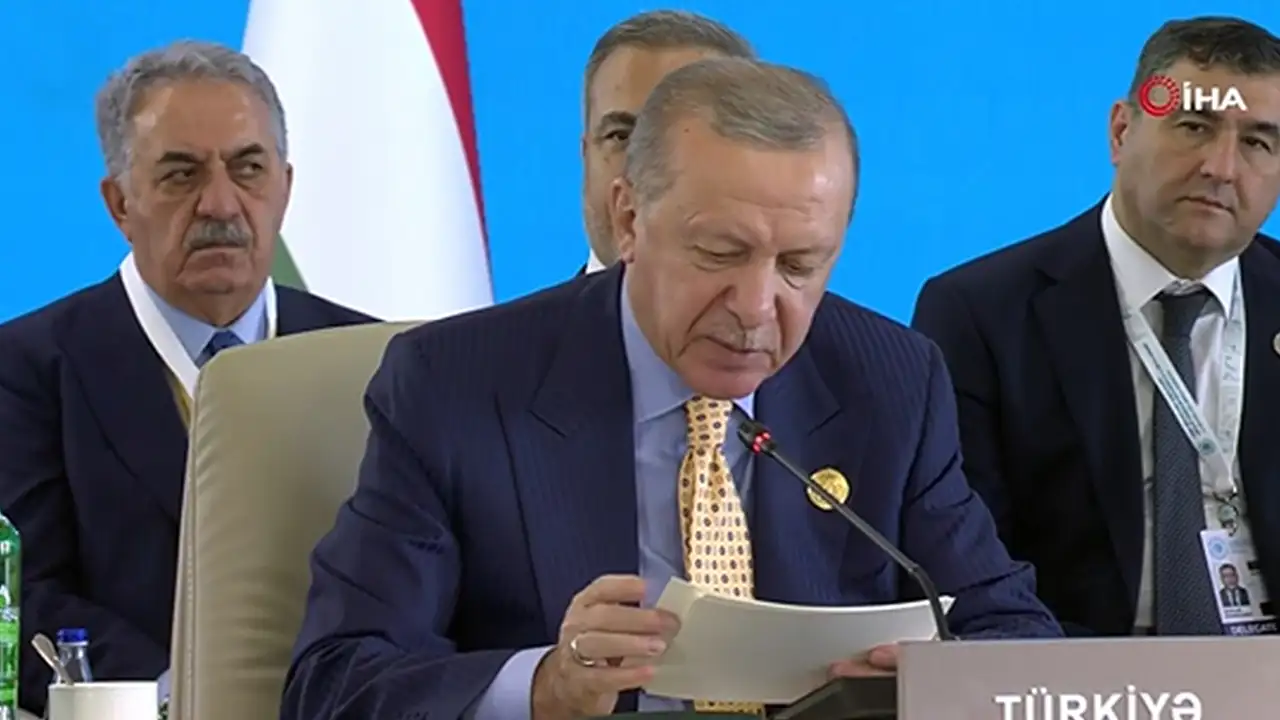 Türk dünyasının bölgenin istikrarında ve güvenliğinde birçok anlamda daha etkin rol üstlenebileceğine inandığını vurgulayan Erdoğan, "Bugün yakın coğrafyamızda yaşanan pek çok çatışma, savaş ve uluslararası hukuk ihlaline karşı teşkilatımızın kararlı duruş sergilemesi önemlidir. İsrail hükümetinin Lübnan ve Suriye ile başlayan Yemen ve İran'la devam eden ve son olarak Katar'ı hedef alan saldırıları bölgemizin istikrarına en büyük tehdidin bu ülkenin mevcut yönetiminden kaynaklandığını gösteriyor. Gazze'de 66 bin masumun hayatına mal olan katliamların durması yönünde son günlerde yaşanan gelişmeler memnuniyet vericidir. Biz ancak Filistin halkının uluslararası meşruiyet ve hukuktan kaynaklanan hakları temelinde iki devletli bir çözümün kalıcı ve adil barışa kapı açacağına inanıyoruz. Bu yönde de çalışmalarımızı kararlılıkla sürdürüyoruz" ifadelerini kullandı.
