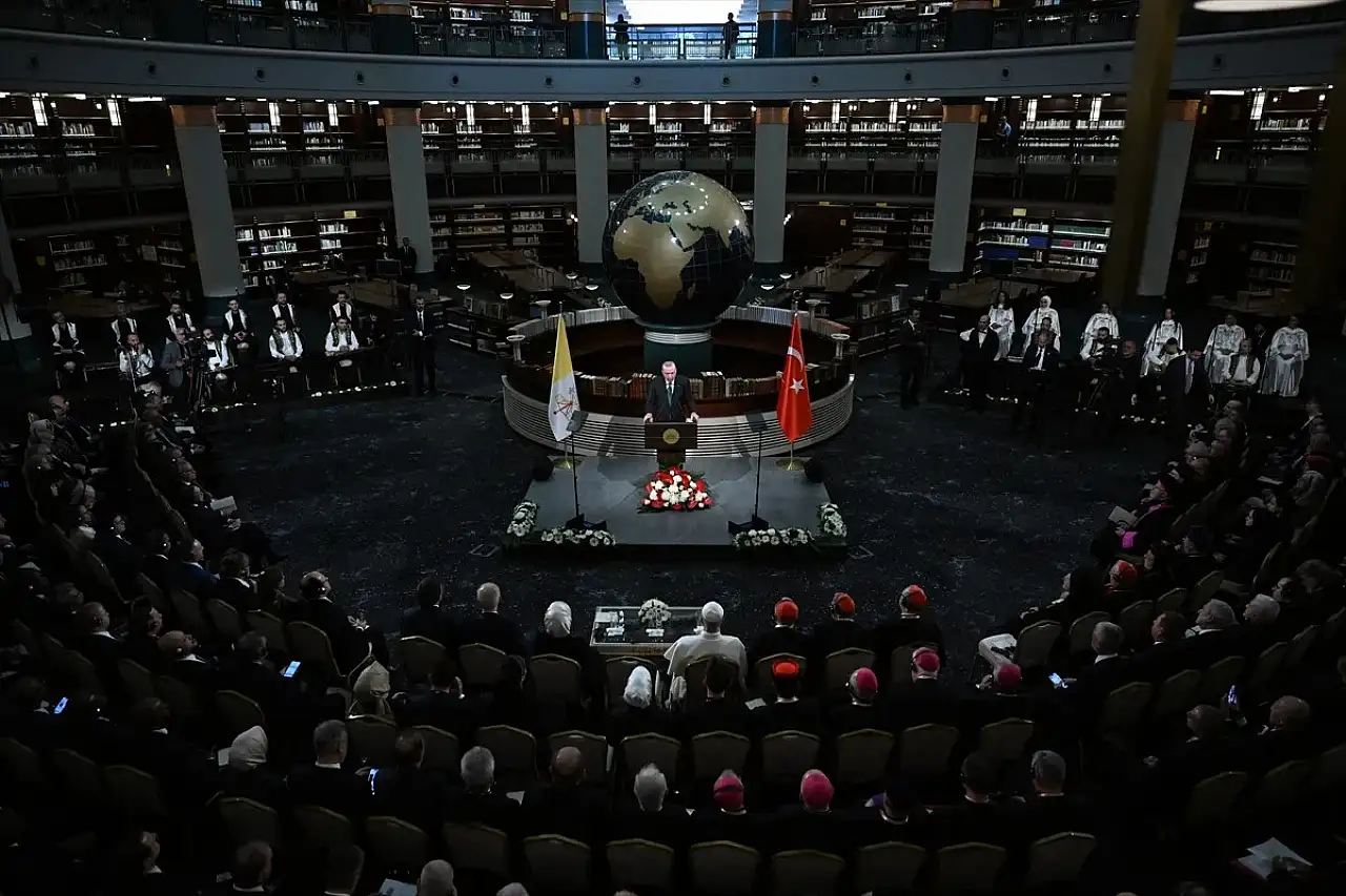 Erdoğan, Cumhurbaşkanlığı Külliyesi'nde, baş başa ve heyetler arası görüşmelerin ardından Vatikan Devlet Başkanı Papa 14. Leo ile Cumhurbaşkanlığı Millet Kütüphanesi'ndeki Cihannüma Salonu'nda davetlilere hitap etti.