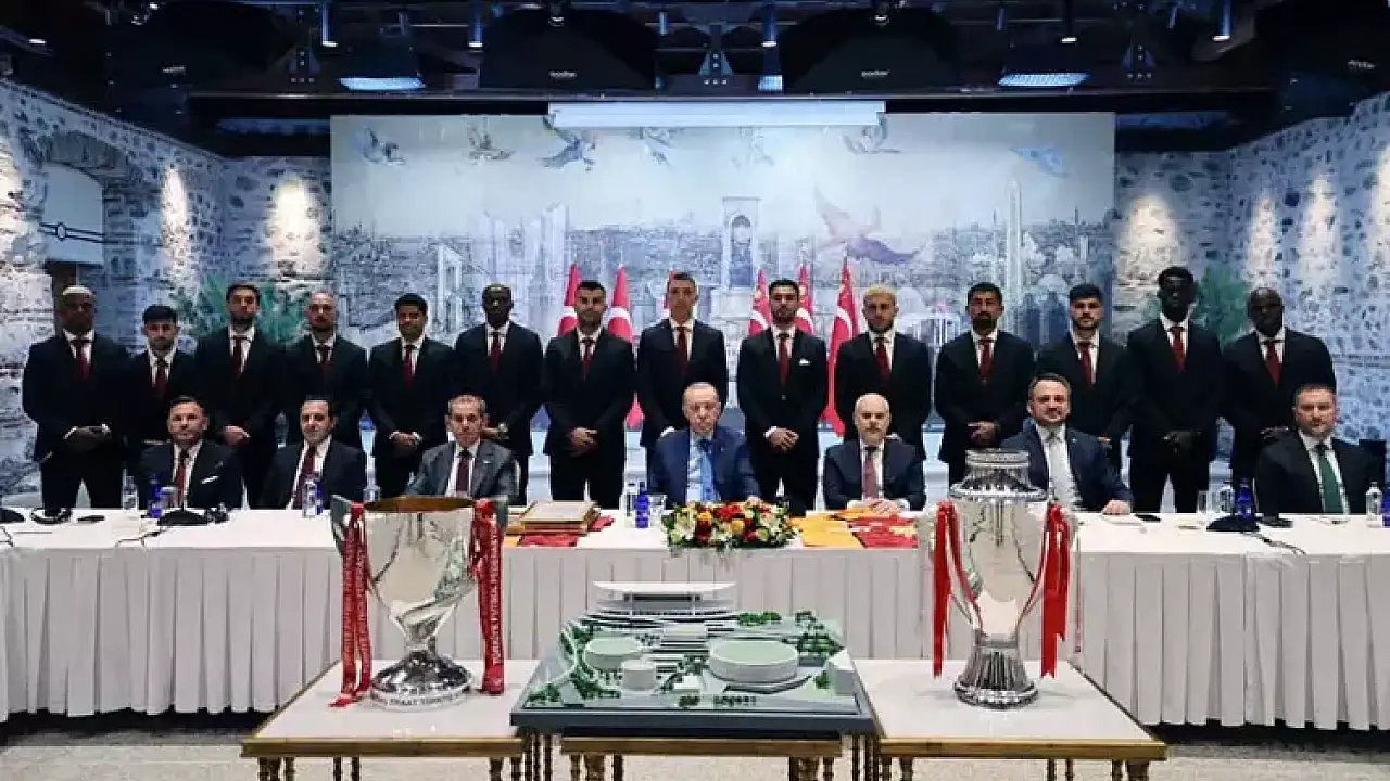 Erdoğan, sezonu Süper Lig ve Türkiye Kupası şampiyonluğuyla noktalayan Galatasaray'ı Dolmabahçe Çalışma Ofisi'nde kabul etti.
