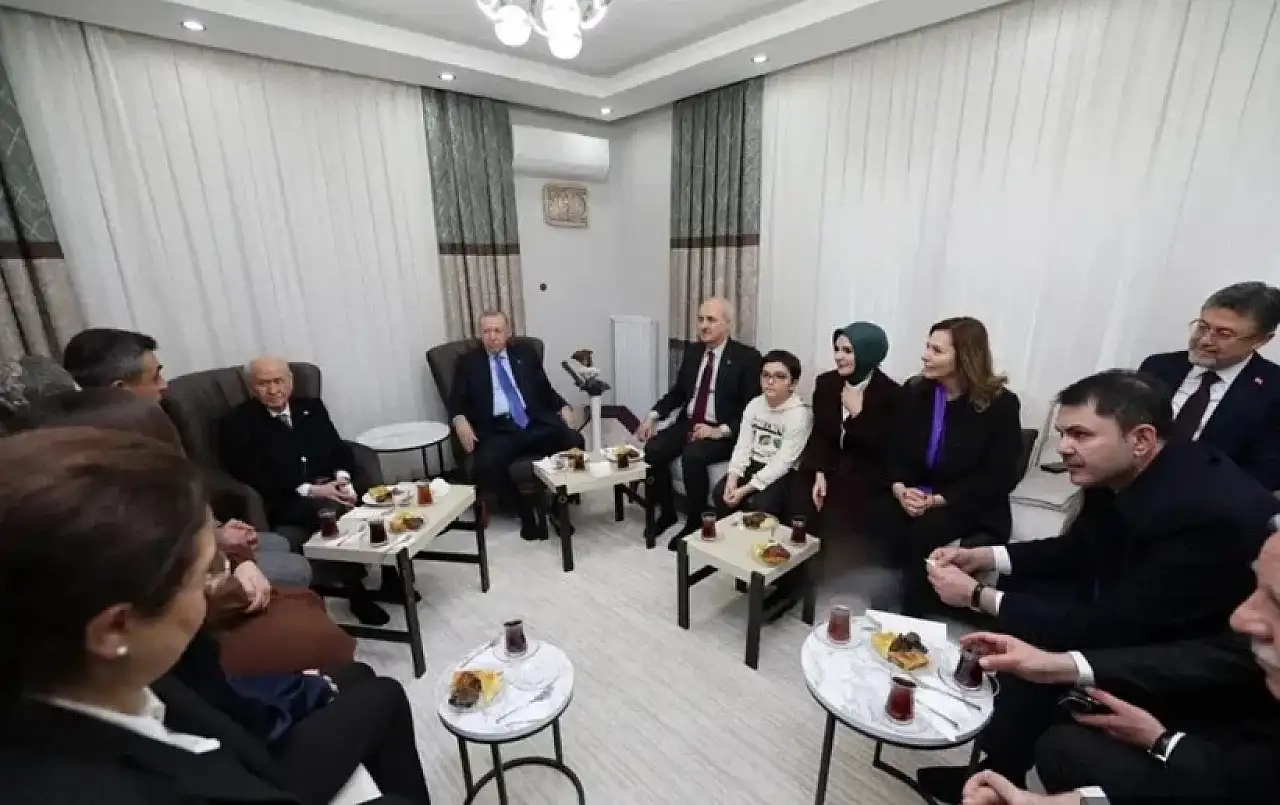 Cumhurbaşkanı Recep Tayyip Erdoğan, MHP Genel Başkanı Devlet Bahçeli ile depremzede bir aileyi yeni evlerinde ziyaret etti.