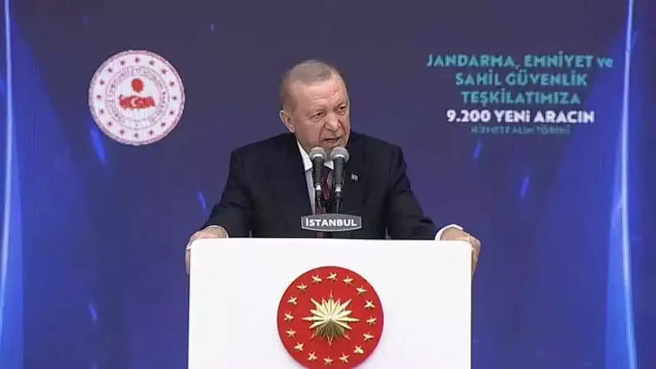 Törende konuşan Cumhurbaşkanı Erdoğan, "Şehirlerde polisimiz, kırsalda jandarmamız, denizlerde Sahil Güvenliğimiz milletimizin huzuru, esenliği ve güvenliği için büyük bir özveriyle çalışıyoruz. Bütün güvenlik güçlerimiz uyum içinde, koordinasyon içinde, Anayasa ve yasalardan aldıkları yetkiler çerçevesinde 86 milyona hizmet ediyor. Huzur ve emniyetimiz için 7 gün 24 saat ülkemizin dört bir yanında, vatanımızın her karış toprağında mesai harcayan güvenlik birimlerimizde görev alan bütün kardeşlerime ülkem ve milletim adına teşekkür ediyorum. Hükümet olarak güvenlik kuvvetlerimizin vazifelerini en iyi şekilde yerine getirmeleri için gerekli her türlü desteği sağlıyoruz. Envanterlerinde bulunan ve ekonomik ömürlerini tamamlayan araçların yenilenmesi çalışmalarını geçen yıl başlattık. Böylece hem görev araçlarımızın niteliğini hem de vatandaşlarımıza sunulan hizmetlerin etkinliğini artırıyoruz. Geçen sene yine burada yaptığımız törenle Jandarma ve Emniyet Teşkilatlarımıza 7 bin 204 yeni aracı kazandırmıştık. Bugün de 9 bin 200 aracı daha resmen sizlerin hizmetine veriyoruz. Bu araçlardan 7 bin 80 tanesi emniyetimiz, 2 bin 70 tanesi jandarmamız, 50 tanesi ise Sahil Güvenliğimiz tarafından kullanılacak. Hayırlı uğurlu olsun diyorum. Sokaklarımızda, mahallelerimizde, köylerimizde gördüğümüz her polisimiz ve jandarmamız ile onların varlığını simgeleyen araçlar vatandaşlarımıza güven verirken, şer yüreklerine de korku salıyor. Yeni araçlarımızın, zehir tacirleri ve şehir eşkıyalarıyla mücadele başta olmak üzere güvenlik ve asayiş faaliyetlerimizin başarılı şekilde ifasında sizlere yardımcı olacağına inanıyorum. Bu araçların Jandarma Genel Komutanlığı, Emniyet Genel Müdürlüğü ve Sahil Güvenlik Komutanlığına kazandırılmasında emeği geçenleri tebrik ediyor, hayırseverlerimize teşekkür ediyorum" şeklinde konuştu