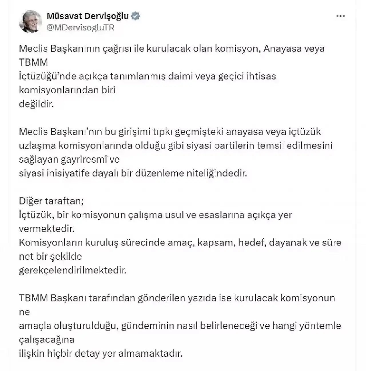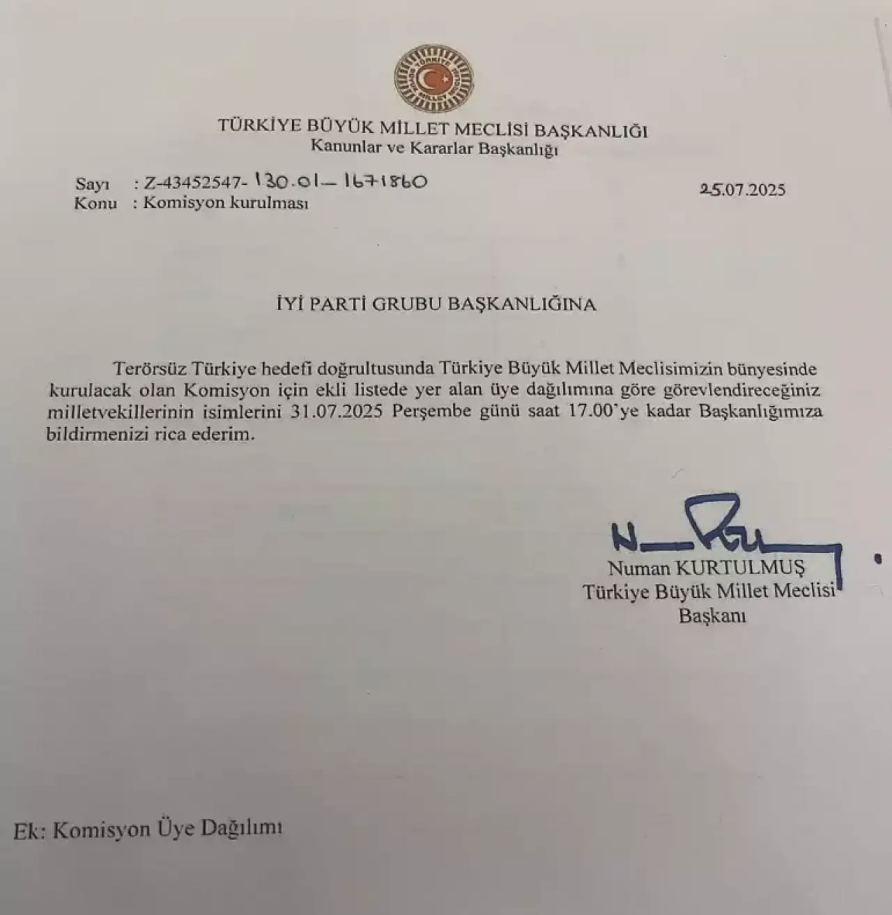 TBMM Başkanı Numan Kurtulmuş, 'Terörsüz Türkiye' süreci kapsamında Meclis'te kurulacak komisyon için partilere yazı gönderdi. Partilerden, 31 Temmuz saat 17.00'ye kadar komisyon için isim vermeleri istendi. İYİ Parti Genel Başkanı Müsavat Dervişoğlu, Meclis Başkanı Kurtulmuş'un gönderdiği yazıyı sosyal medya hesabından paylaşarak konuya ilişkin açıklamada bulundu. Dervişoğlu, "Meclis Başkanının çağrısı ile kurulacak olan komisyon, anayasa veya TBMM İçtüzüğü'nde açıkça tanımlanmış daimi veya geçici ihtisas komisyonlarından biri değildir. Meclis Başkanı’nın bu girişimi tıpkı geçmişteki anayasa veya içtüzük uzlaşma komisyonlarında olduğu gibi siyasi partilerin temsil edilmesini sağlayan gayriresmi ve siyasi inisiyatife dayalı bir düzenleme niteliğindedir. Diğer taraftan; İçtüzük, bir komisyonun çalışma usul ve esaslarına açıkça yer vermektedir. Komisyonların kuruluş sürecinde amaç, kapsam, hedef, dayanak ve süre net bir şekilde gerekçelendirilmektedir" dedi.