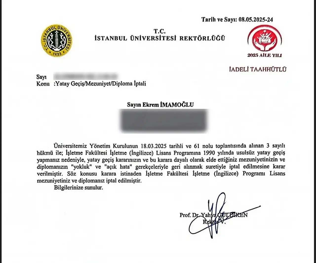 “Üniversitemiz Yönetim Kurulunun 18.03.2025 tarihli toplantısında alınan hükmü ile; İşletme Fakültesi İşletme (İngilizce) Lisans Programına 1990 yılında usulsüz yatay geçiş yapmanız nedeniyle, yatay geçiş kararınızın ve bu karara dayalı olarak elde ettiğiniz mezuniyetinizin ve diplomanızın ‘yokluk’ ve ‘açık hata’ gerekçeleriyle geri alınmak suretiyle iptal edilmesine karar verilmiştir. Söz konusu karara istinaden İşletme Fakültesi İşletme (İngilizce) Programı Lisans mezuniyetiniz ve diplomanız iptal edilmiştir.”