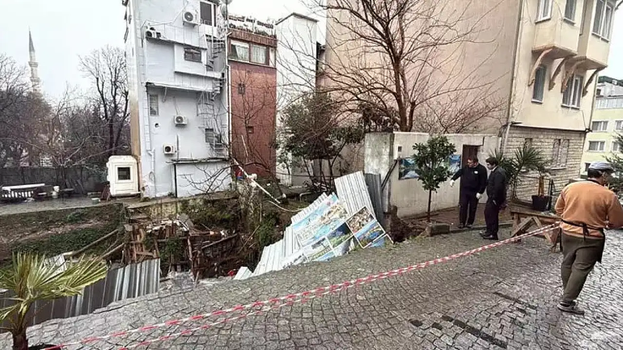 Fatih'te bir otelin önündeki yol toprak kayması sonrası çöktü.