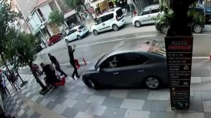 Kontrolü kaybeden sürücü, kaldırımda oturan grubun arasına daldı. Aracın üzerine geldiğini fark ederek zıplayan şahıs aracın çarpması ile taklalar attı.