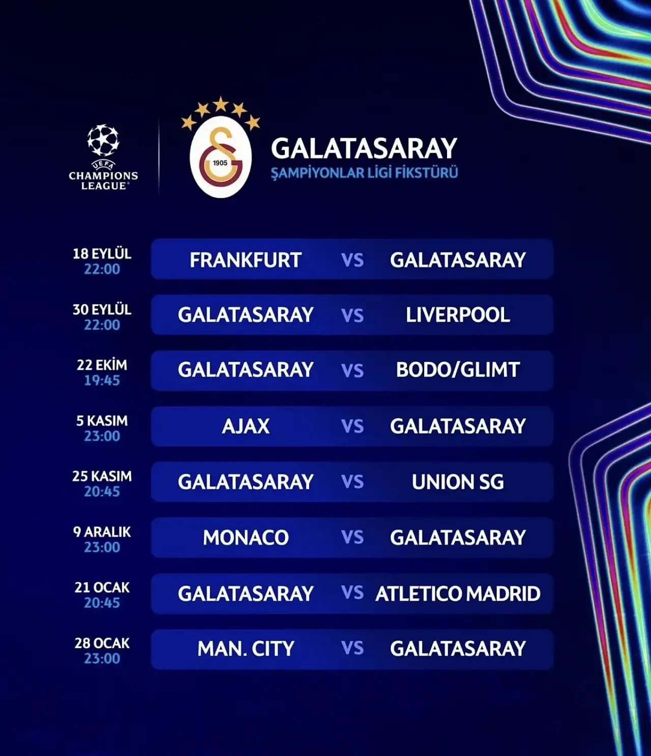 Galatasaray'ın Şampiyonlar Ligi 2025/26 sezonu maç takvimi şöyle: