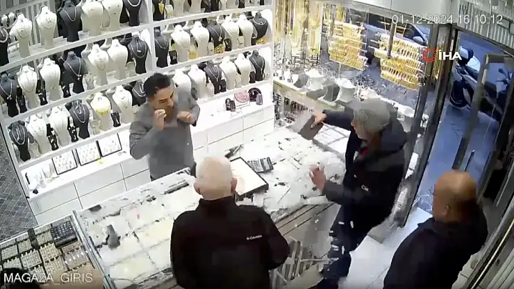 Taşla kuyumcunun cam tezgahını kıran şüpheli, altınları çalmaya çalıştı. Tezgahtan eline direkt altın gelmeyen şüpheli, dükkandan ayrılmak için kapıya gittiğinde şoke oldu.
