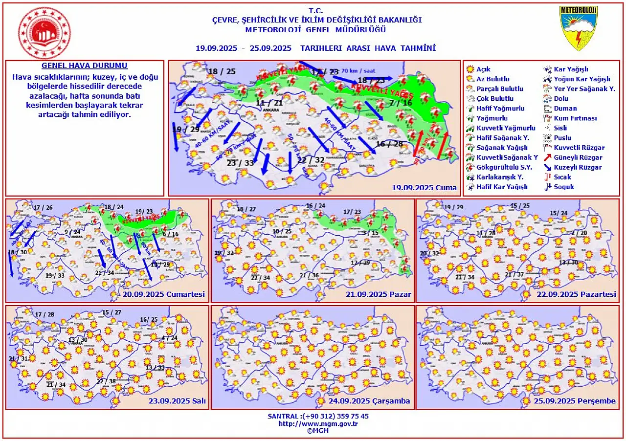 Meteoroloji Genel Müdürlüğü tarafından yapılan son tahminlere göre yurdun kuzey, iç ve doğu bölgelerinde hissedilir derecede azalan hava sıcaklıklarının hafta sonunda batı kesimlerden başlayarak tekrar artacağı tahmin ediliyor.
