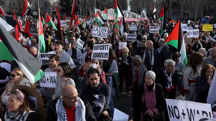 İspanya'nın başkenti Madrid'de Filistin'e destek için yürüyen binlerce kişi, uluslararası topluma "derhal ve kalıcı ateşkes için İsrail'e baskı yapması" çağrısında bulundu.