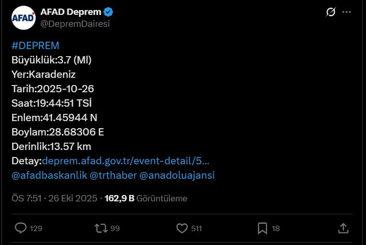 Afet ve Acil Durum Yönetimi Başkanlığının (AFAD) internet sitesinde yer alan bilgiye göre, merkez üssü Karadeniz olan 3,7 büyüklüğünde (Ml) bir sarsıntı kaydedildi. Depremin 13,57 kilometre derinlikte meydana geldiği belirlendi.