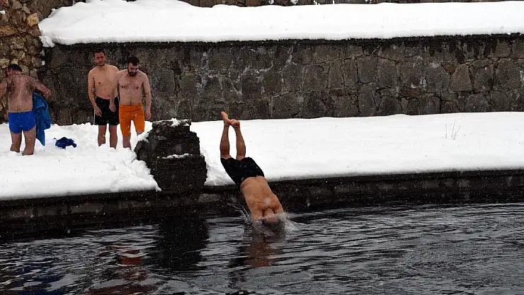 Bitlis'te Beş Minare Akademi Düşünce Derneği üyeleri, dondurucu soğuğa aldırış etmeden etrafı karlı kaplı göle girdi. Dernek üyelerini izleyenler üzerilerindeki kalın montlara rağmen üşürken, soğuk onların umrunda bile olmadı.
