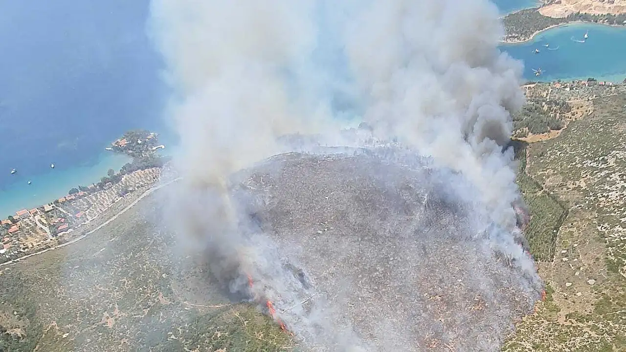 İzmir'in Karaburun ilçesinde çıkan orman yangının kontrol altına alınması için ekiplerin havadan ve karadan müdahalesi devam ediyor.