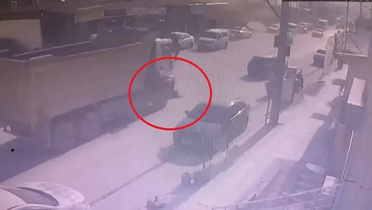 Antakya ilçesi Akasya Mahallesi'nde trafikte seyreden hafriyat kamyonu ile motosiklet çarpıştı. Çarpışma sonucu metrelerce sürüklenen motosiklet sürücüsü kamyonun altında kaldı. Kazada aracın altında kalan motosiklet sürücüsünün kamyonun altından kendi imkanlarıyla çıktığı anlarsa güvenlik kamerasına yansıdı.