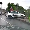Eskişehir'de ıslak zeminde kontrolden çıkan Tesla jipin bariyere saplandığı trafik kazasında maddi hasar oluştu.