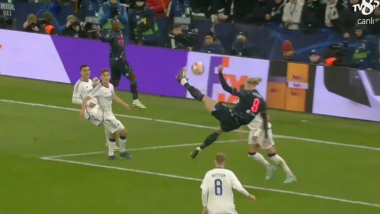 Havadan kafayla bile güçlükle vurulabilecek topa yükselerek ayağıyla vuran Haaland'ın vuruşu esnasında akrobatik bir hareket ortaya çıktı.