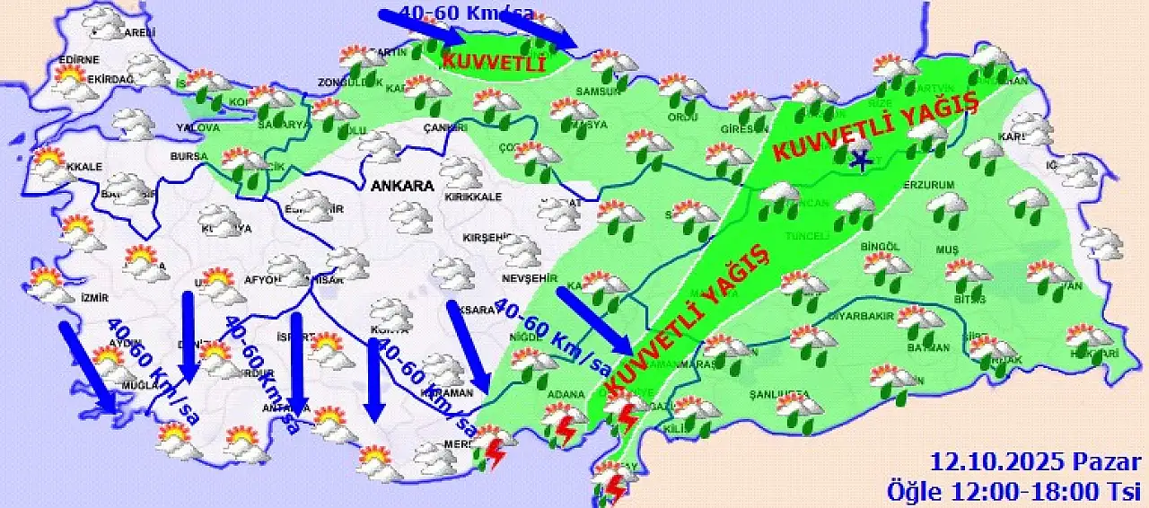 KUVVETLİ RÜZGÂR UYARISI: Rüzgârın,; Güney Ege, Akdeniz’in iç kesimleri, İç Anadolu’nun güneyi ve Orta Karadeniz kıyılarında kuzeyli yönlerden, Doğu Anadolu’da güneyli yönlerden kuvvetli olarak (40-60 km/saat) esmesi beklendiğinden yaşanabilecek olumsuzluklara karşı dikkatli ve tedbirli olunması gerekmektedir.