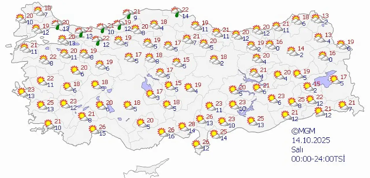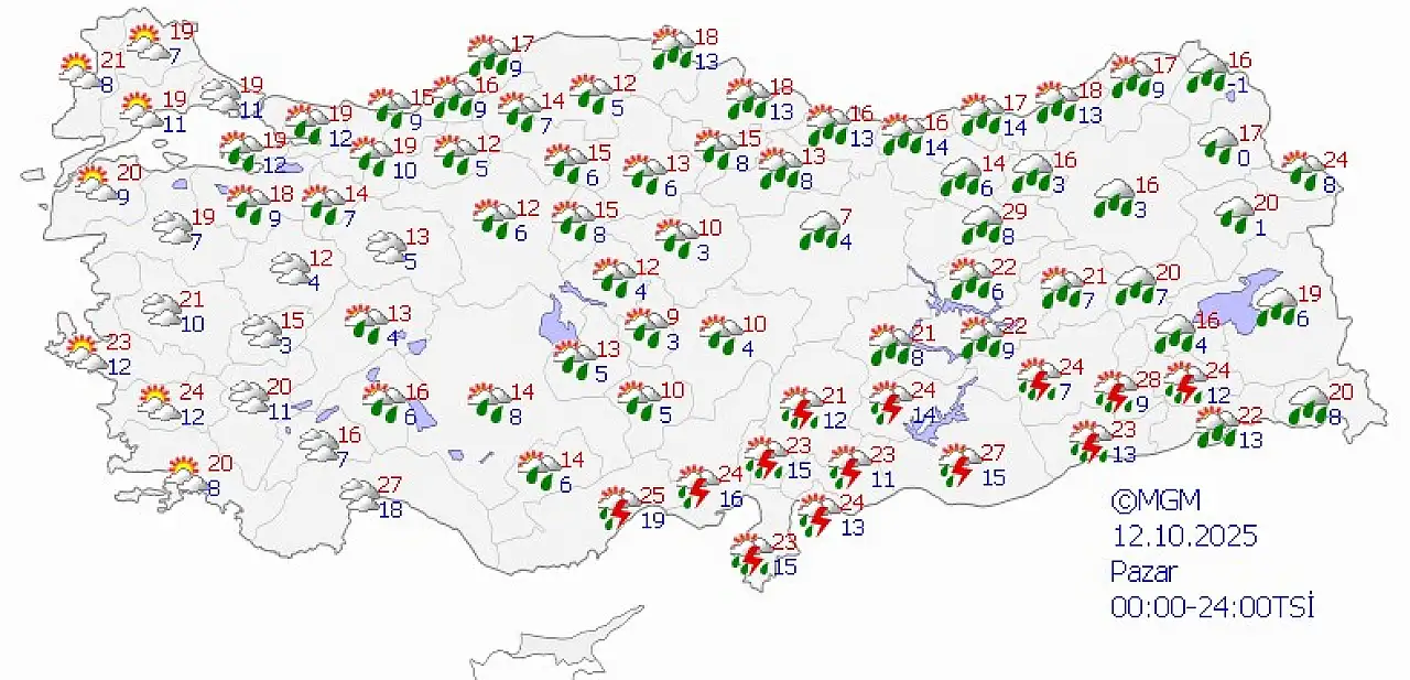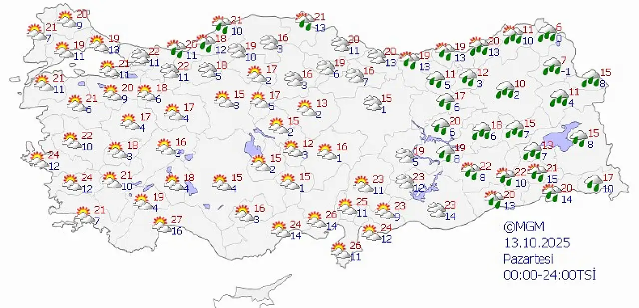 Meteoroloji Genel Müdürlüğü tarafından yapılan tahminlere göre: Ülkemiz genelinin parçalı ve çok bulutlu, Marmara’nın doğusu, Doğu Akdeniz, İç Anadolu'nun güney ve doğusu, Karadeniz, Doğu ve Güneydoğu Anadolu'nun yağışlı geçeceği tahmin ediliyor. Genellikle yağmur ve sağanak, İç Anadolu’nun kuzeydoğusunun yüksekleri, Doğu Karadeniz’in iç kesimlerinin yüksekleri ile Doğu Anadolu’nun kuzey ve doğusunun yüksek kesimlerinde karla karışık yağmur ve yer yer kar şeklinde görülmesi beklenen yağışların; Batı Karadeniz kıyıları, Doğu Karadeniz, Doğu Anadolu, Güneydoğu Anadolu'nun doğusu ile Ordu, Tokat, Sivas, Kahramanmaraş, Osmaniye, Adana'nın doğusu ve Hatay kıyılarında yerel kuvvetli olması bekleniyor.