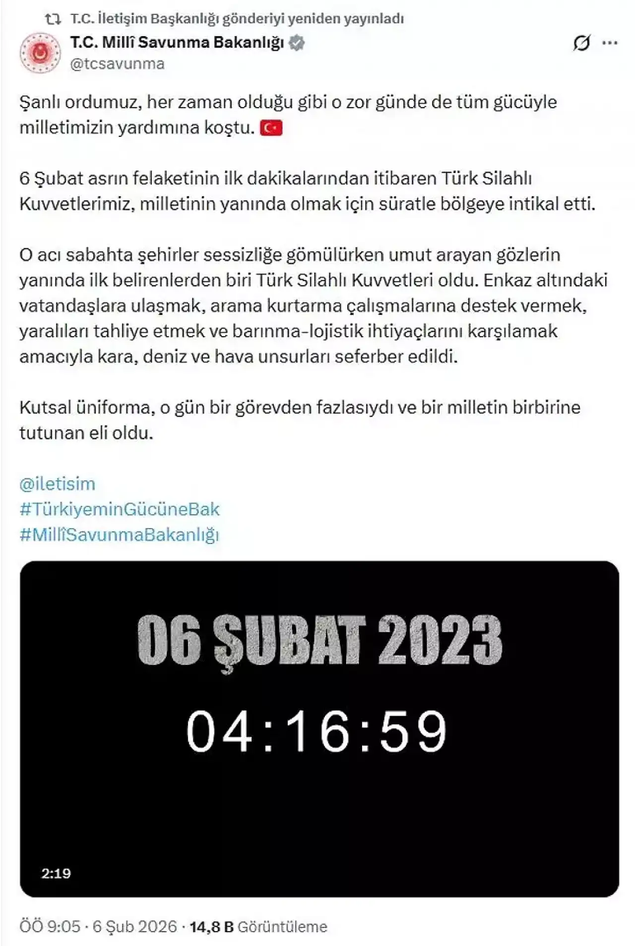 Bakanlığın sanal medya hesabından paylaştığı görüntülerde, Mehmetçik'in enkaz altından kurtardığı depremzede vatandaşların açıklamaları ile deprem bölgesinde yürütülen insani yardım faaliyetleri yer aldı. Bakanlıktan yapılan açıklamada, "Şanlı ordumuz, her zaman olduğu gibi o zor günde de tüm gücüyle milletimizin yardımına koştu. 6 Şubat 'Asrın Felaketi'nin ilk dakikalarından itibaren Türk Silahlı Kuvvetlerimiz, milletinin yanında olmak için süratle bölgeye intikal etti. O acı sabahta şehirler sessizliğe gömülürken umut arayan gözlerin yanında ilk belirenlerden biri Türk Silahlı Kuvvetleri oldu. Enkaz altındaki vatandaşlara ulaşmak, arama kurtarma çalışmalarına destek vermek, yaralıları tahliye etmek ve barınma-lojistik ihtiyaçlarını karşılamak amacıyla kara, deniz ve hava unsurları seferber edildi. Kutsal üniforma, o gün bir görevden fazlasıydı ve bir milletin birbirine tutunan eli oldu" denildi.