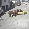 Nevşehir'de ahırdan kaçan bir boğa, ortalığı birbirine kattı. Zincirinden kurtularak kasaba içinde dolaşmaya başlayan kızgın boğa, park halindeki otomobile zarar verdi. O anlar güvenlik kamerasına yansıdı.