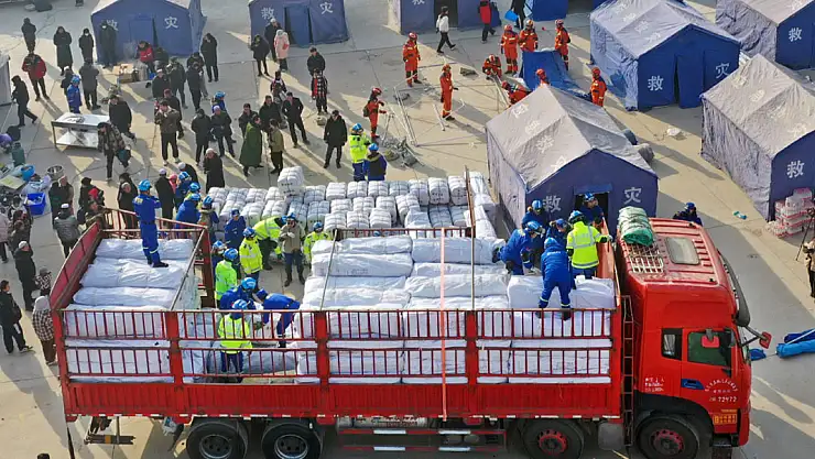 Kuzeybatı Çin'in Gansu eyaletinin Linxia Hui özerk vilayetindeki Jishishan ilçesinde çadırlar ve diğer yardım malzemeleri dağıtılıyor.