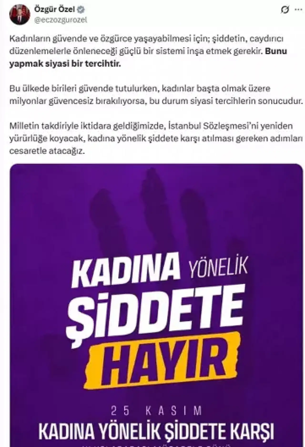 Özgür Özel, sosyal medya hesabından Kadına Yönelik Şiddete Karşı Uluslararası Mücadele Günü nedeniyle yaptığı paylaşımda, "Kadına yönelik şiddete karşı kadınların güvende ve özgürce yaşayabilmesi için; şiddetin, caydırıcı düzenlemelerle önleneceği güçlü bir sistemi inşa etmek gerekir. Bunu yapmak siyasi bir tercihtir. Bu ülkede birileri güvende tutulurken, kadınlar başta olmak üzere milyonlar güvencesiz bırakılıyorsa, bu durum siyasi tercihlerin sonucudur. Milletin takdiriyle iktidara geldiğimizde, İstanbul Sözleşmesi’ni yeniden yürürlüğe koyacak, kadına yönelik şiddete karşı atılması gereken adımları cesaretle atacağız" dedi.