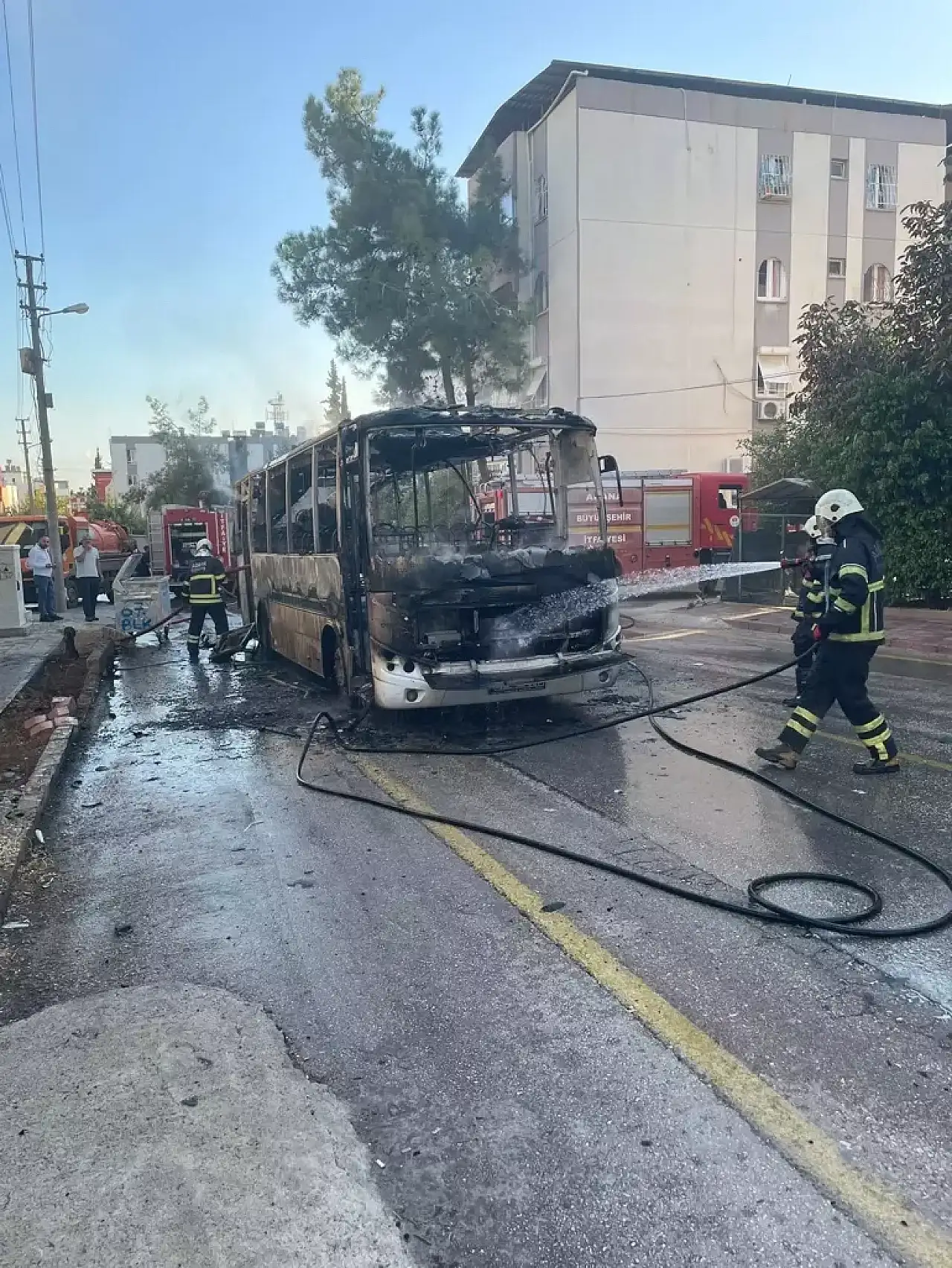 Adana'da park halindeyken yangın çıkan özel halk otobüsü, kullanılamaz hale geldi.