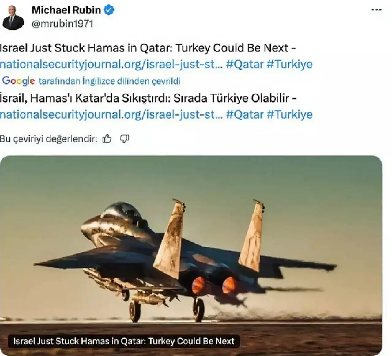 ABD merkezli yorumcu ve İsrail sözcüsü olarak bilinen Michael Rubin de, sosyal medya hesabından yaptığı açıklamada, Katar’daki Hamas varlığının hedef alınmasının ardından sıradaki hamlenin Türkiye olabileceğini ileri sürdü.